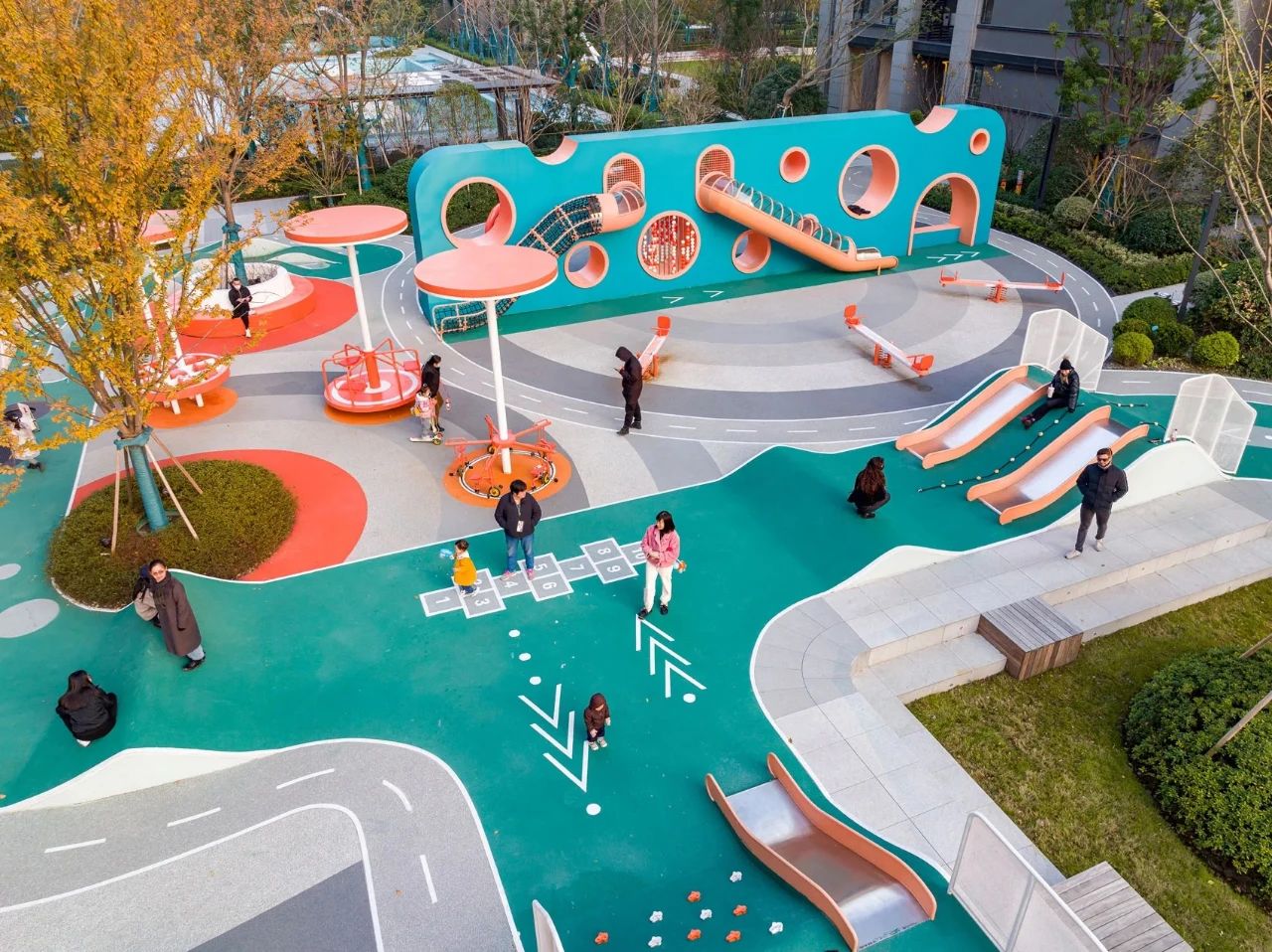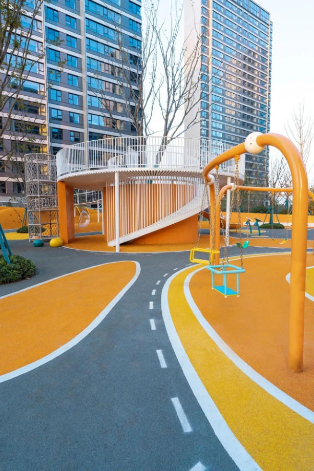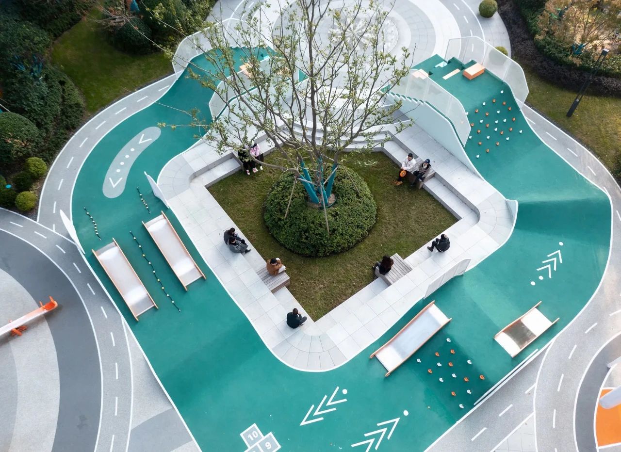 為了讓周圍樓的居民都能看到、辨認(rèn)和可讀,設(shè)計(jì)師用醒目的藍(lán)綠色創(chuàng)造了一個(gè)巨大的漢字,然后把它變成了一個(gè)游樂(lè)場(chǎng)。當(dāng)書(shū)法筆畫(huà)被幾何化時(shí),非常適合成為充滿障礙挑戰(zhàn)性和有趣功能性的游樂(lè)活動(dòng)方式,以鼓勵(lì)社交互動(dòng)。因此,它的名字,M?(my)Way-做我想做。